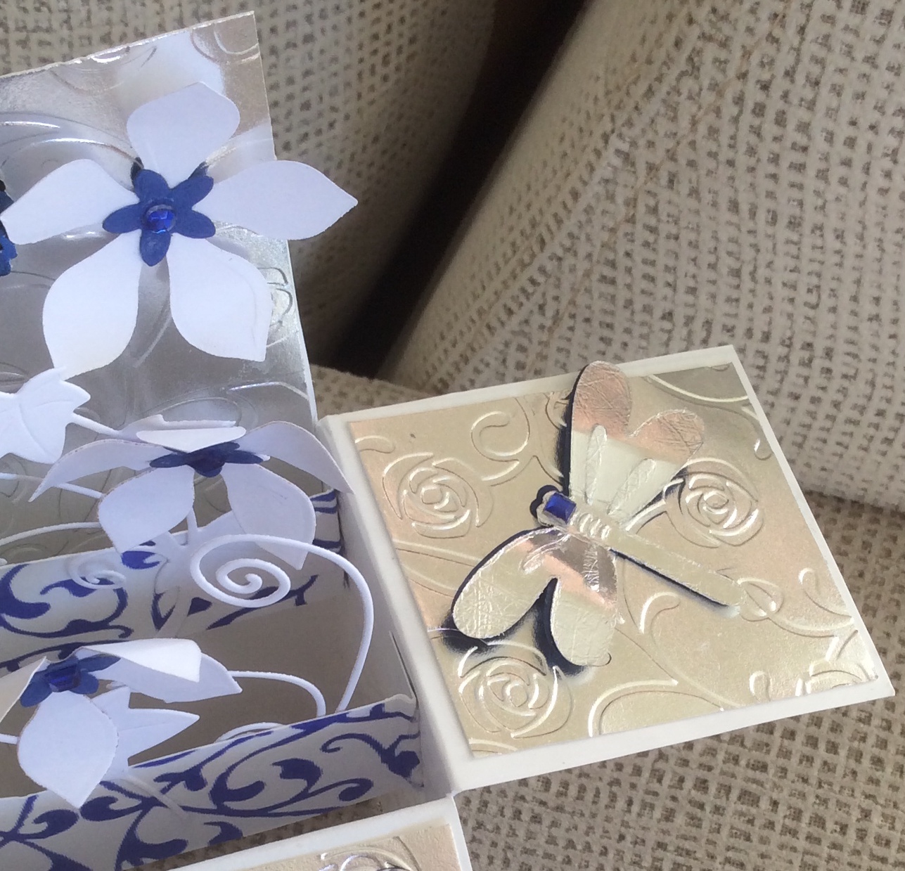I die cut the dragonflies twice using blue card underneath to create a shadow effect. You can just see the blue and white card inside. This was the card I used to make the box card. It was white on the reverse. So I mat and layered it with silver card that I ran through the embossing machine to give it some texture. The flowers and swirls are also die cut. I then added blue gems to the centres and on the dragonflies.